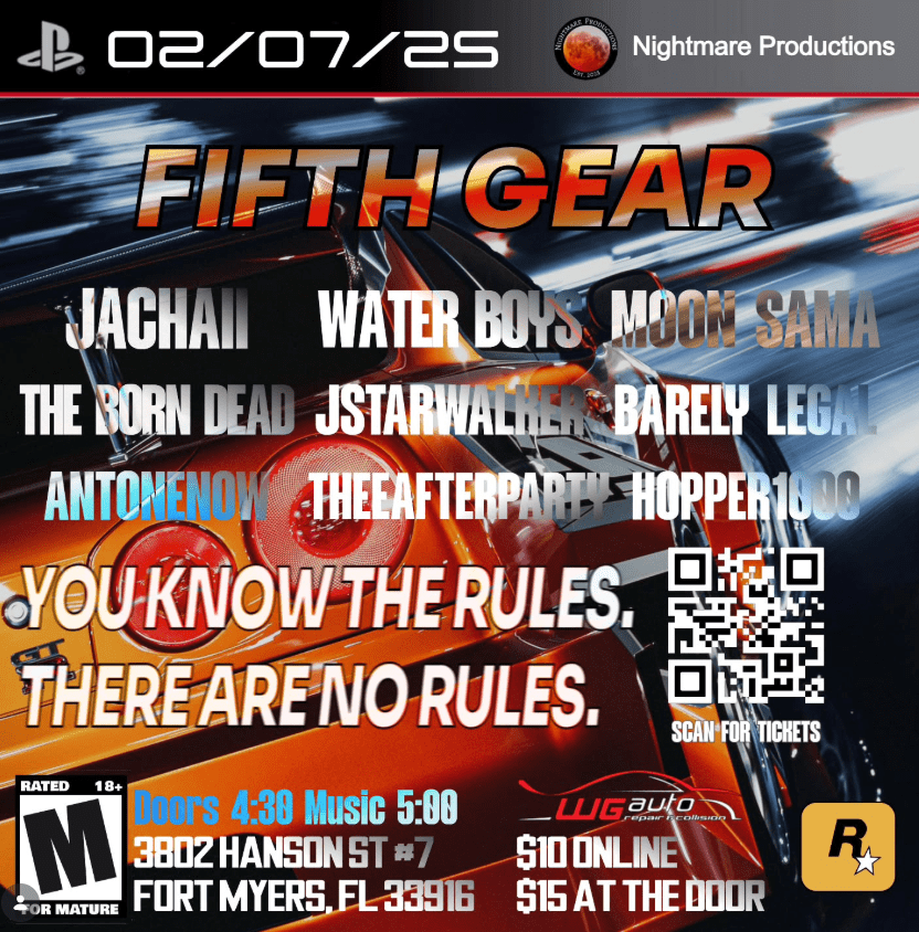 February 7th 2026 Nightmare Productions is kicking the new year off with their first ever car/music show : Fifth Gear. Enjoy a wide selection of the coolest cars in SWFl, and some of their favorite artists as well. Presale tickets are $10.00 and Door is $15.00. Doors at 4:30PM and Music at 5:00PM. 18+ only!