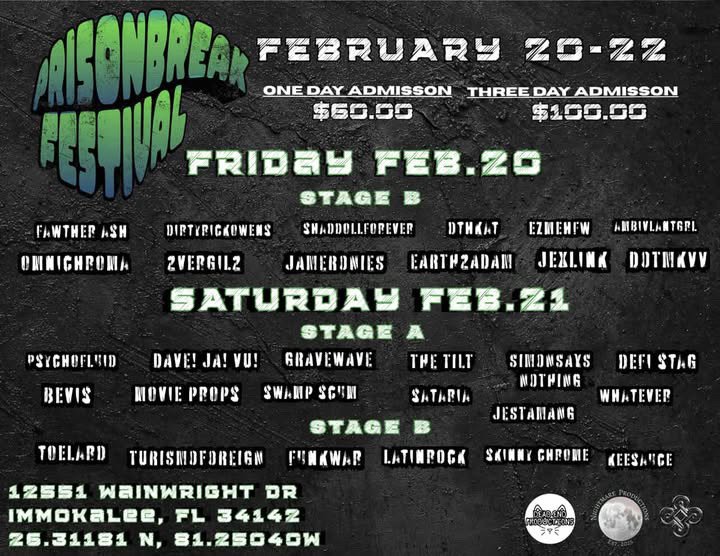 February 20th-22nd DeadEndProductions is headed to the abandoned prison in Immokalee for the prison break festival. We start music at 11pm and goes all night.